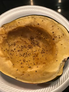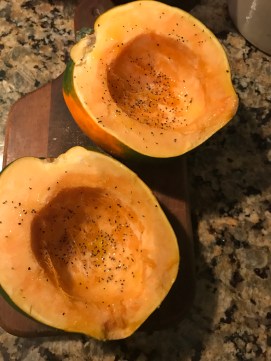 Cut the squash in half lengthwise. Clean out the seeds and stringy middle of the squash. Drizzle olive oil over the squash to prevent the squash from becoming too dry during the baking. Sprinkle with salt, or no salt if you are watching your sodium, black pepper and paprika. If you are baking in the oven, pre-heat oven to 350 and gently spray pan with cooking spray or line with parchment paper and place the squash inside down on the pan and bake 45 minutes or until tender when a fork is inserted. If you choose to bake your squash in the microwave, follow the same process above when seasoning and place inside face up and bake for five minutes and check to ensure the squash is tender. Remember microwaves vary in cooking time. If the inside of the squash is not tender, bake for an additional five minutes. When I microwave acorn squash, I typically bake it for ten minutes.
