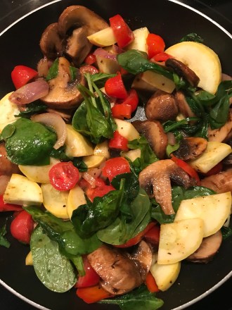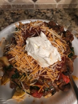 While the squash is baking you will need to prepare sauce. Set aside and spray a large frying pan with cooking spray and add a tablespoon of extra virgin olive oil. Heat pan, but don’t over heat. Add diced onion and peppers and a sprinkle of pepper and salt. Stir and cook but don’t allow them to caramelize. Add sliced or diced zucchini and squash and sauté until nearly tender, but still has a bit of a bite. Sprinkle with salt, pepper, paprika, cumin, and add sliced portobello mushrooms and meatless ground. If your groundless meat is dry, you may need to add a little extra virgin olive oil as the mixture simmers due to the mushrooms soaking up the moisture. Once the mushrooms become tender add the diced tomatoes and taco seasoning and baby spinach. Allow to simmer at a low heat for eight to ten minutes and remove from the heat. You do not want the zucchini and squash to be overdone.
