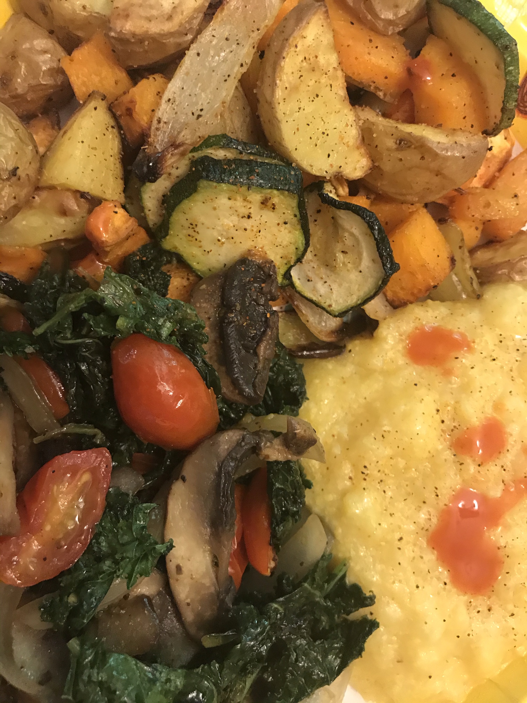 The most recent dish that I’ve made include, creole roasted veggies, with a wilted kale salad, and polenta on the side. I’ve been posting pictures of my vegan meals and tagging our daughter, who is also vegan, on Facebook. We’ve gotten a lot of great feedback, as well aroused much curiosity, and also had a lot of requests for recipes. So…here goes!